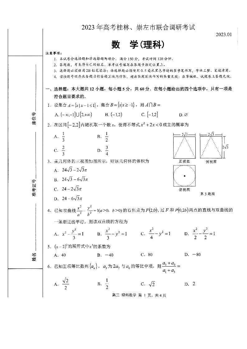 高三理数--广西桂林、崇左市2023年高考联合一模调研考试