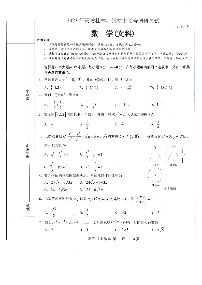 高三文数--广西桂林、崇左市2023年高考联合一模调研考试