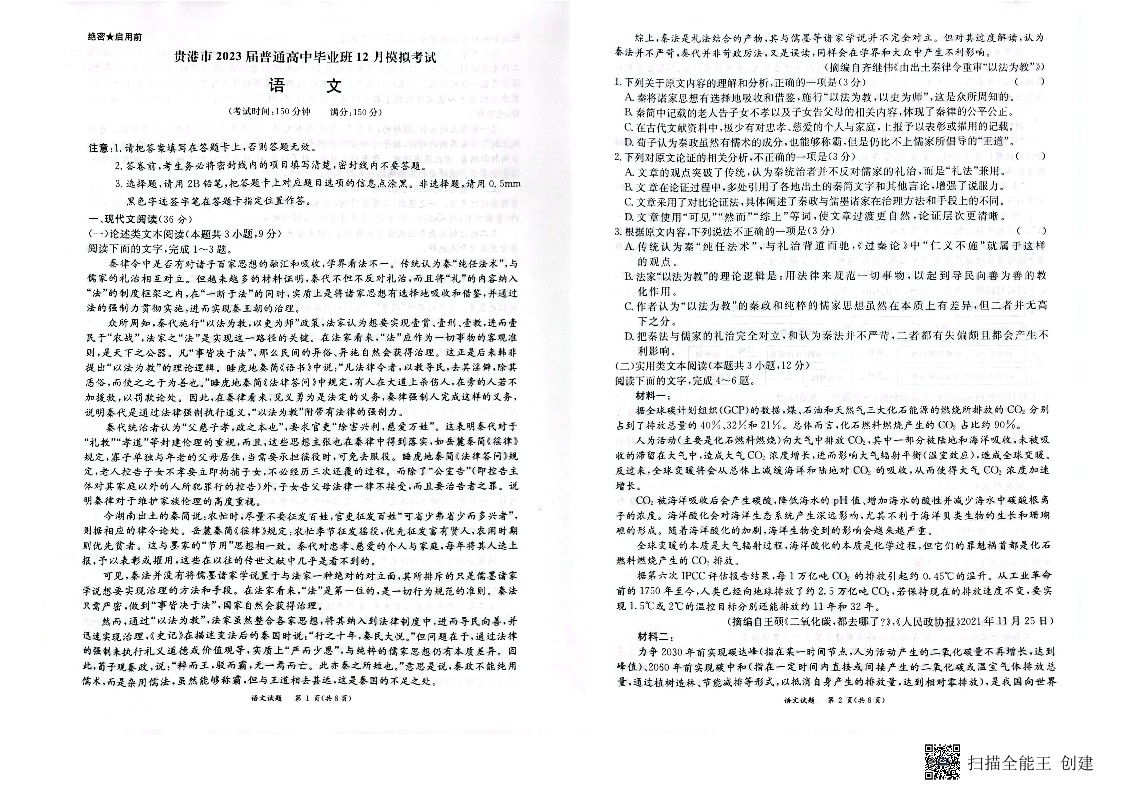 高三语文--广西贵港市2022-2023学年普通高中毕业班12月模拟考试