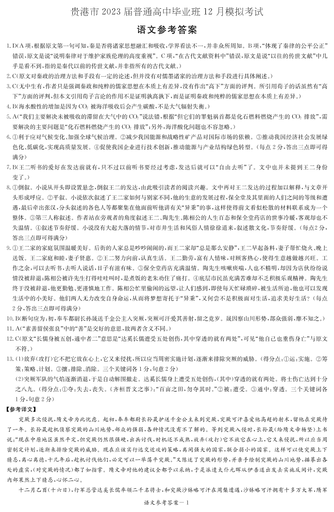 高三语文答案--广西贵港市2022-2023学年普通高中毕业班12月模拟考试