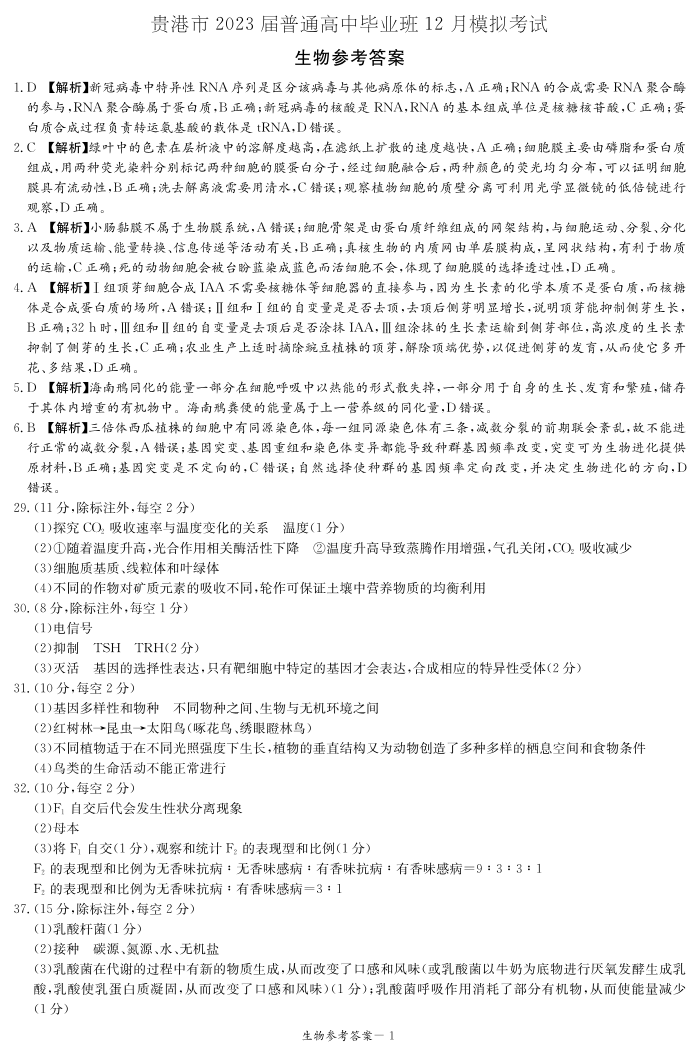 高三理综答案--广西贵港市2022-2023学年普通高中毕业班12月模拟考试