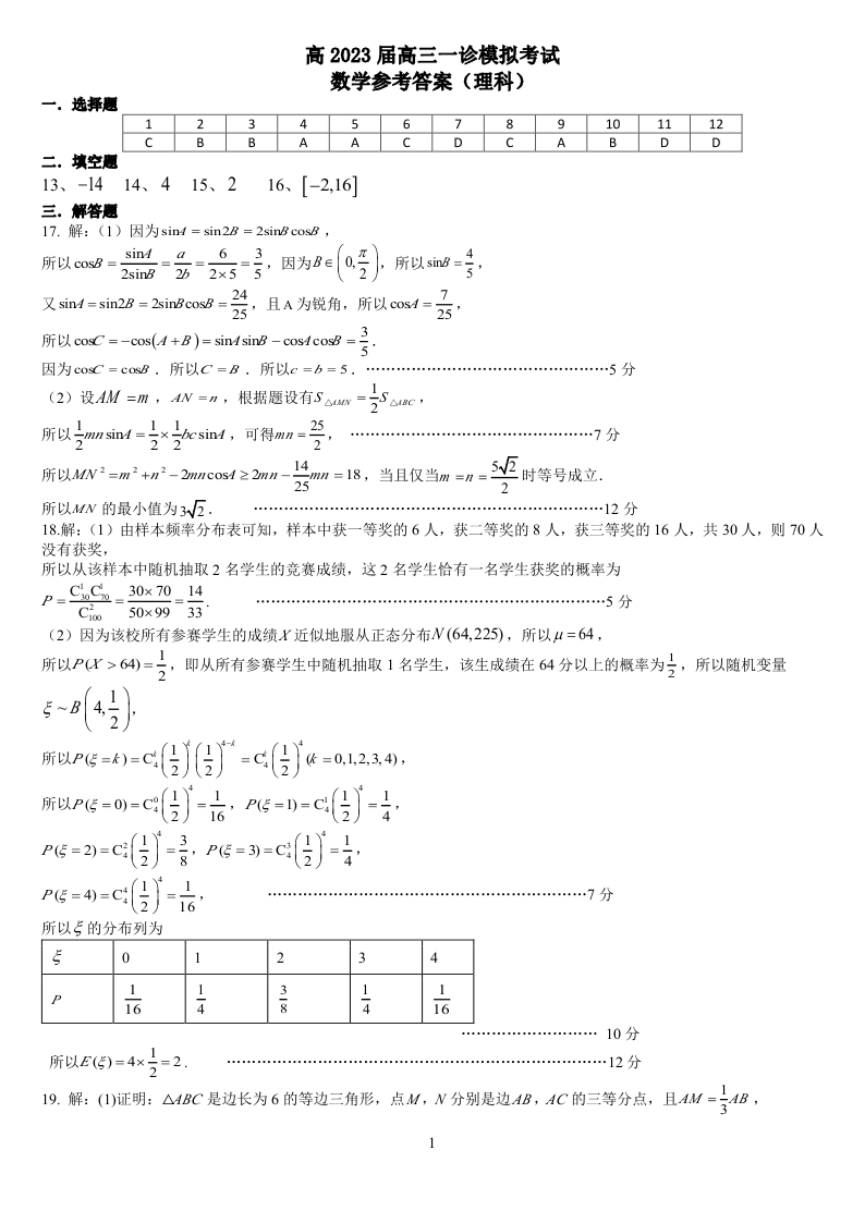 高三理数答案--四川省成都七中2023届高三一诊模拟考试