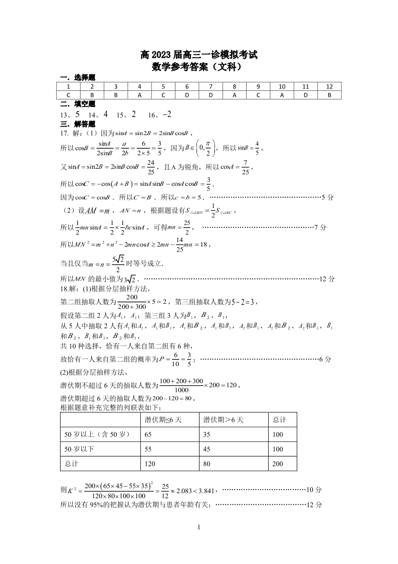 高三文数答案--四川省成都七中2023届高三一诊模拟考试