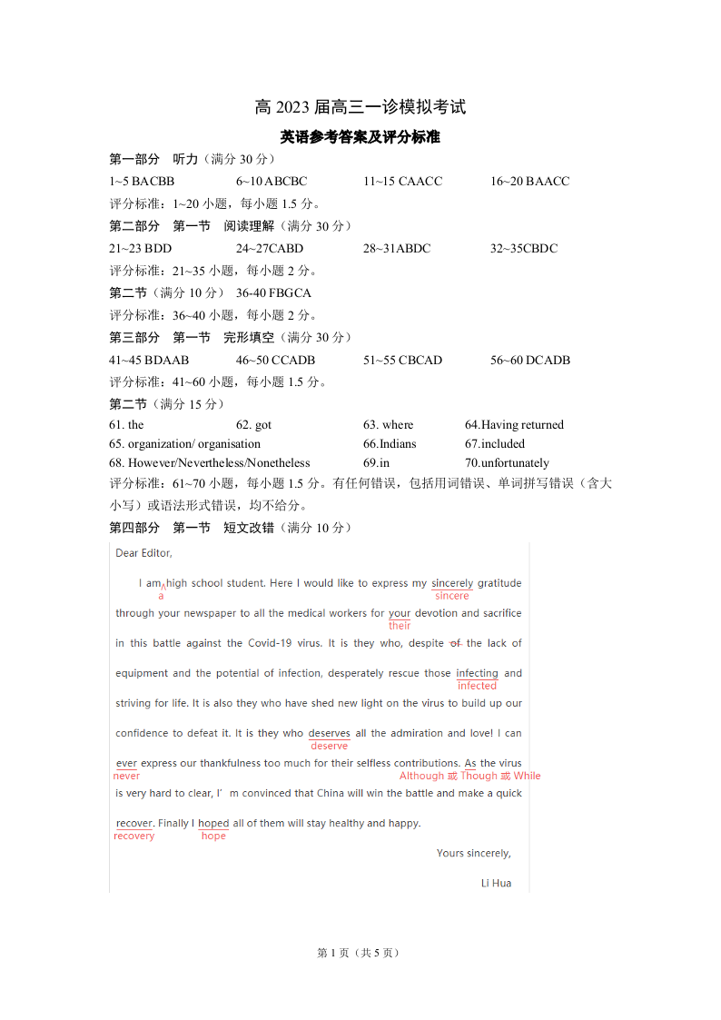 高三英语答案--四川省成都七中2023届高三一诊模拟考试