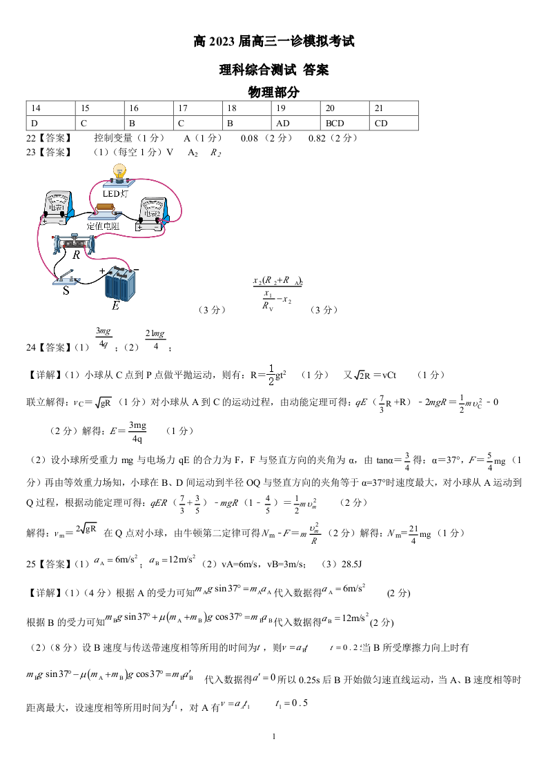 高三理综答案--四川省成都七中2023届高三一诊模拟考试