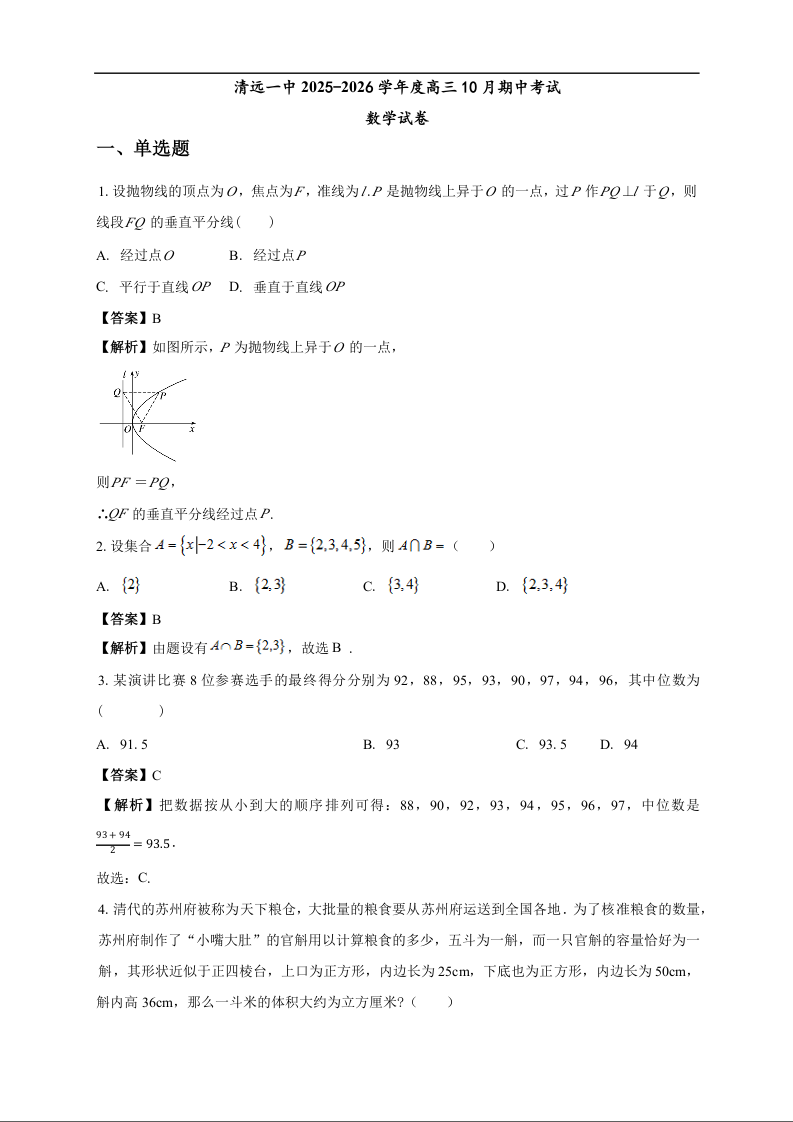 高三数学(精品解析版)--广东省清远市第一中学2026届高三上学期10月期中考试