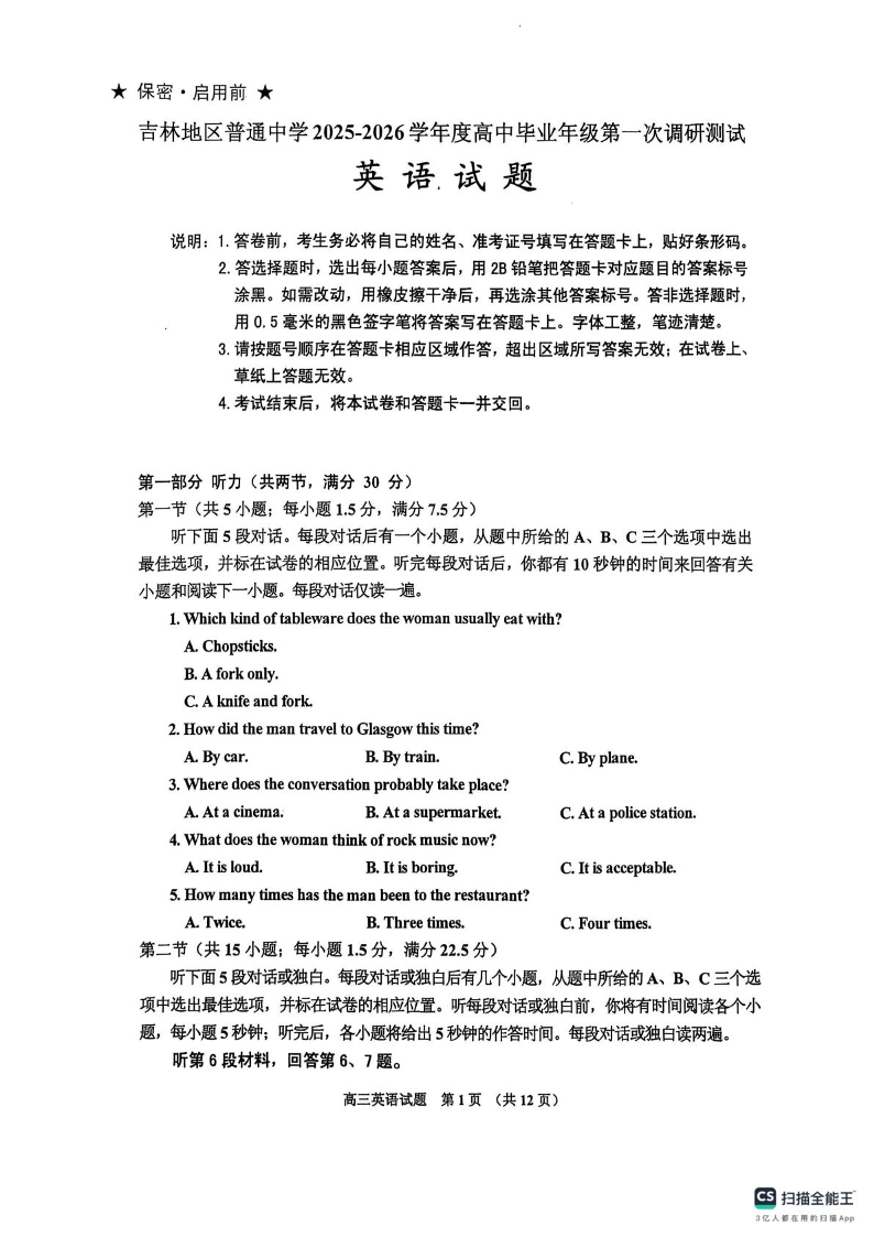 高三英语--吉林省吉林市普通中学2026届高三上学期10月第一次调研测试