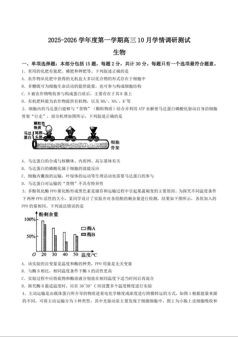 高三生物+答案--江苏省扬州市高邮市2026届高三上学期10月学情调研测试