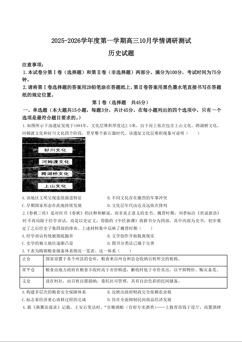 高三历史+答案--江苏省扬州市高邮市2026届高三上学期10月学情调研测试