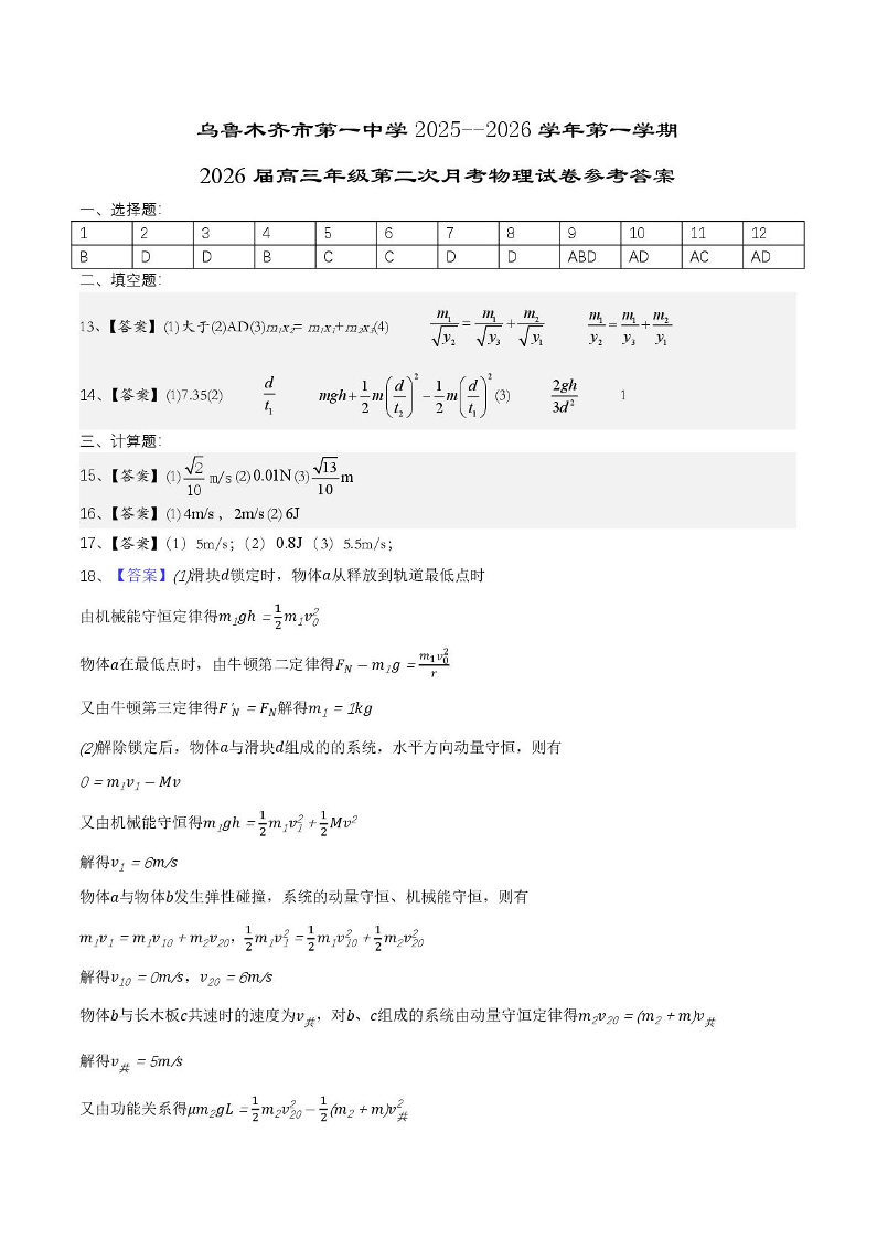 高三物理答案--新疆乌鲁木齐市第一中学2026届高三年级第二次月考