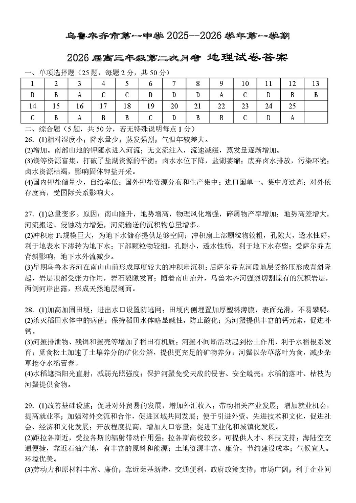 高三地理答案--新疆乌鲁木齐市第一中学2026届高三年级第二次月考
