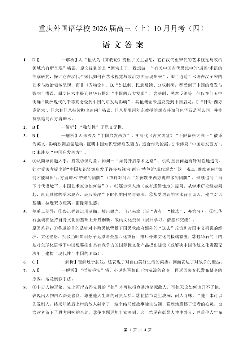 高三语文答案--重庆实验外国语学校2026届高三10月月考(四)