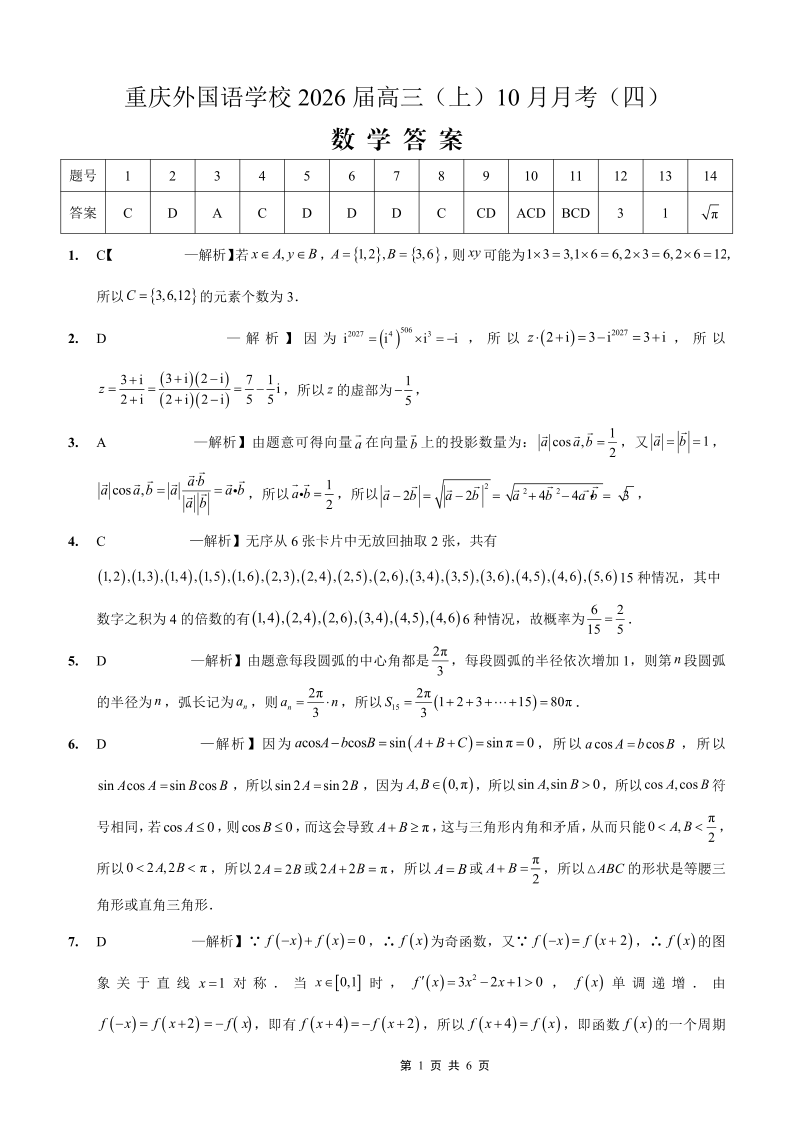 高三数学答案--重庆实验外国语学校2026届高三10月月考(四)