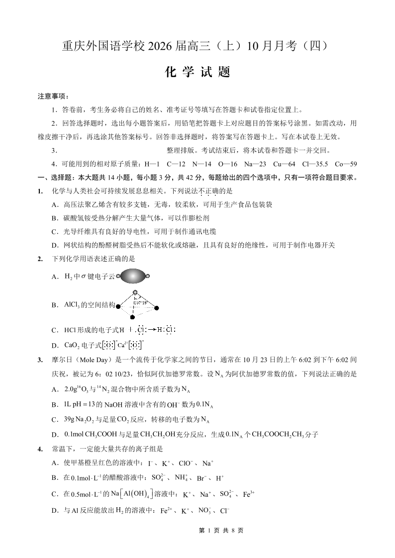 高三化学--重庆实验外国语学校2026届高三10月月考(四)