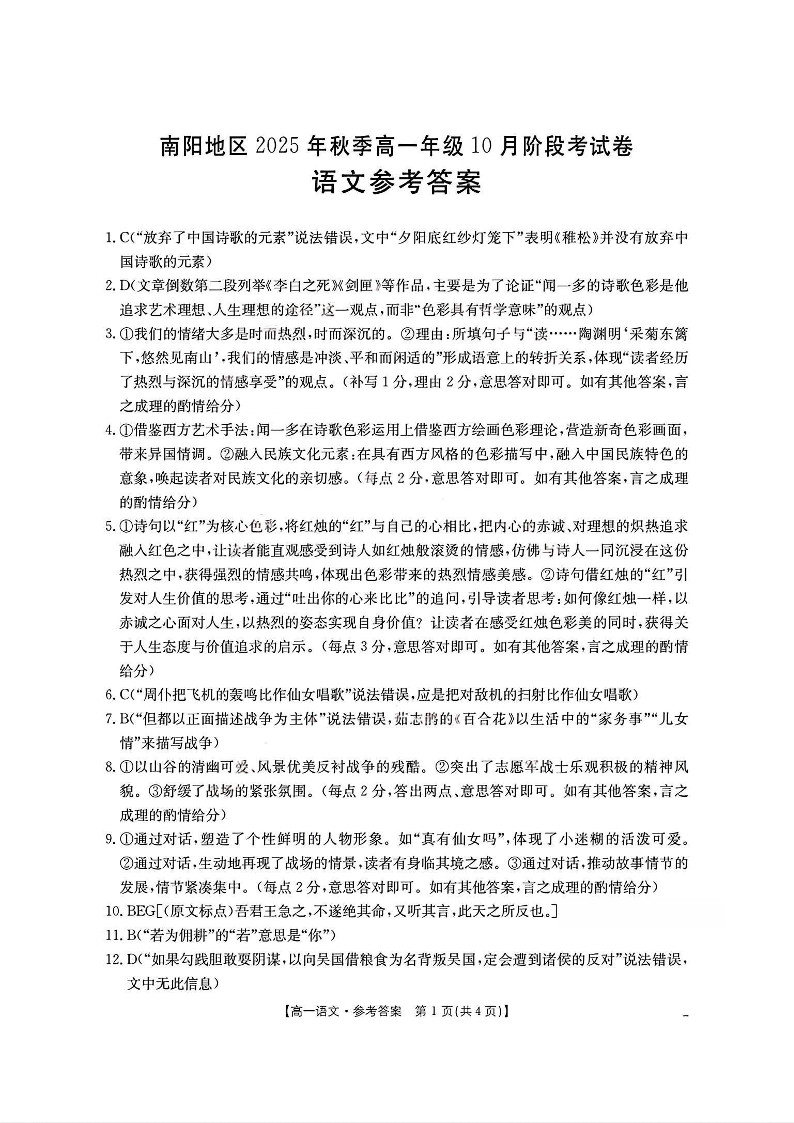 高一语文答案--河南省南阳地区2025年秋季高一10月阶段考试卷