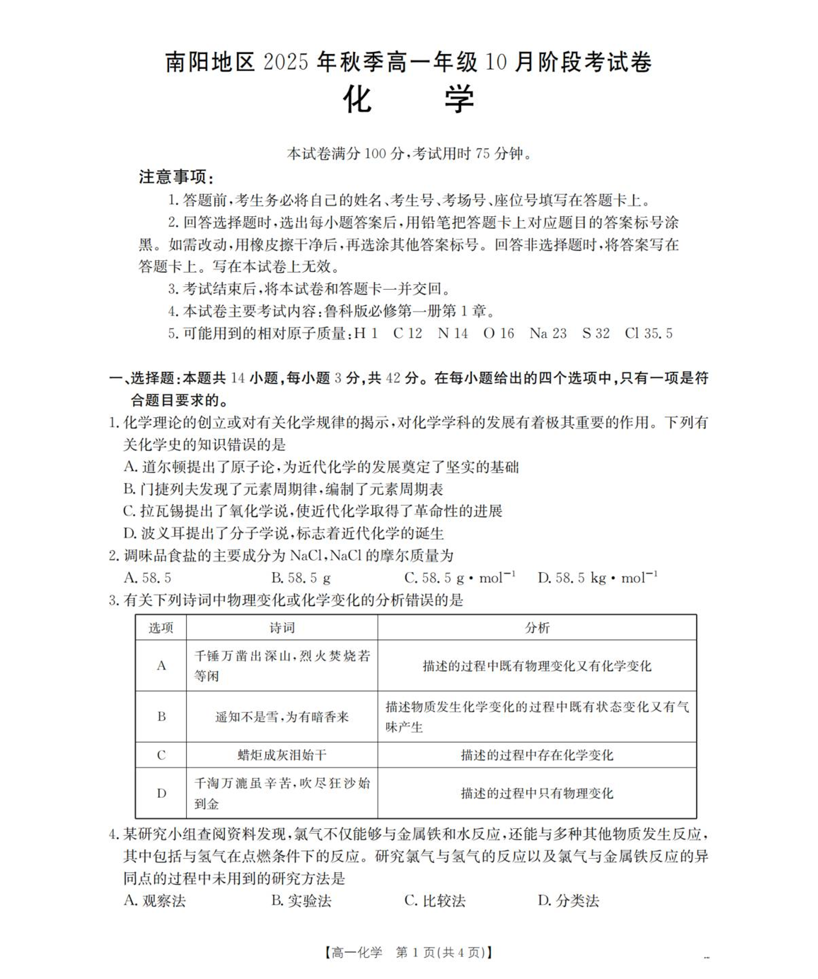 高一化学--河南省南阳地区2025年秋季高一10月阶段考试卷