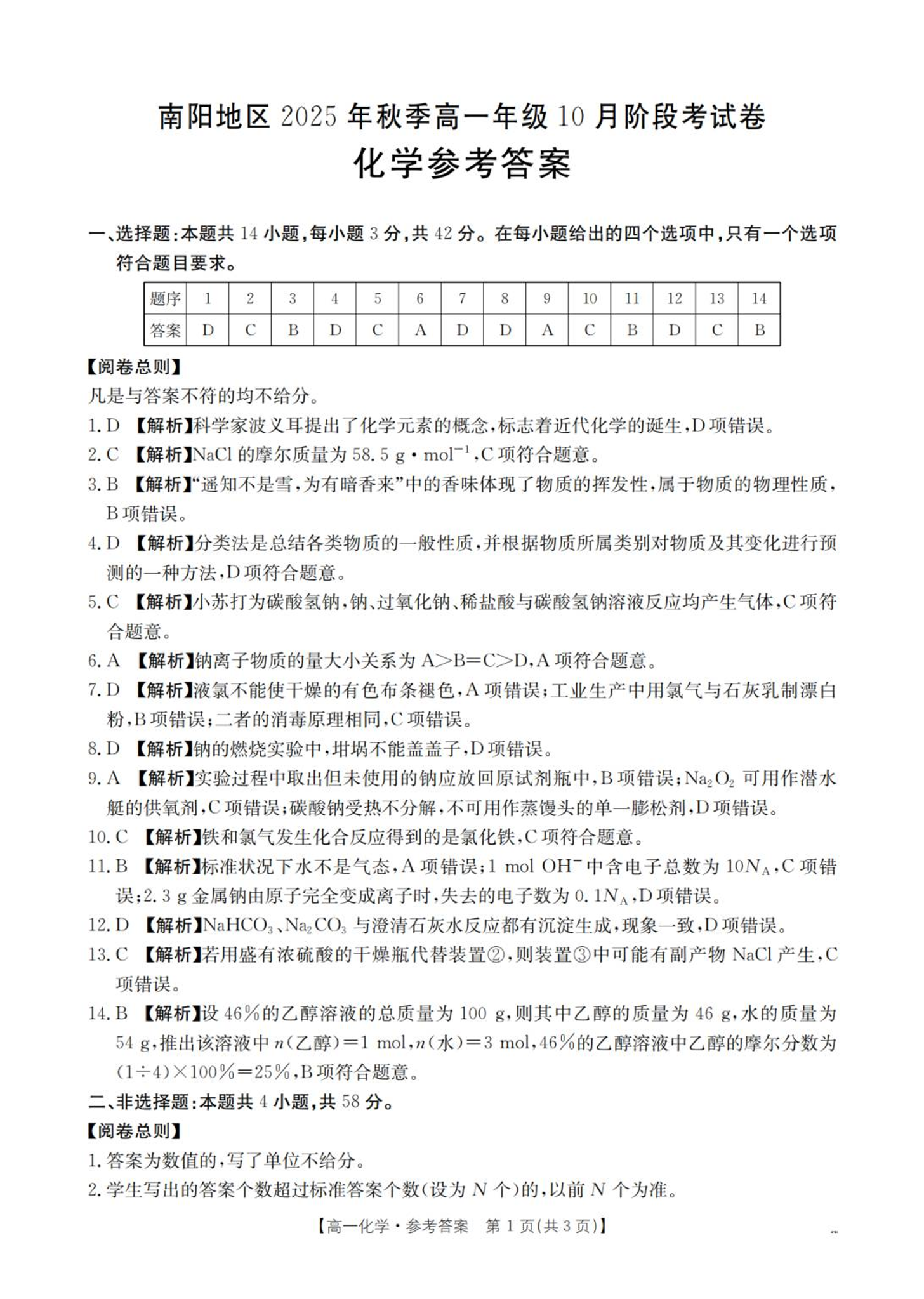 高一化学答案--河南省南阳地区2025年秋季高一10月阶段考试卷