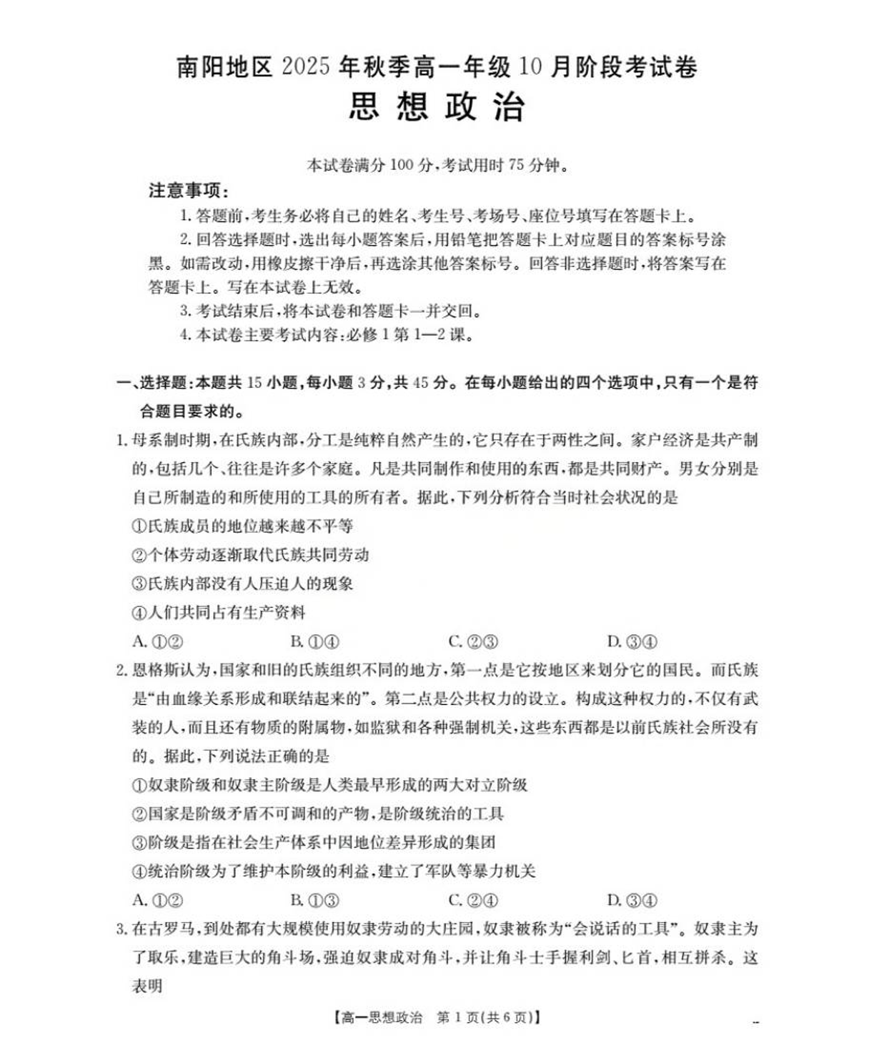 高一政治--河南省南阳地区2025年秋季高一10月阶段考试卷