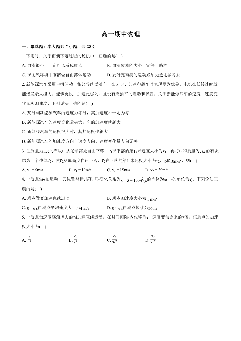 高一物理+答案--湖北省黄冈市黄梅县育才高级中学2025-2026学年高一上学期10月期中考试