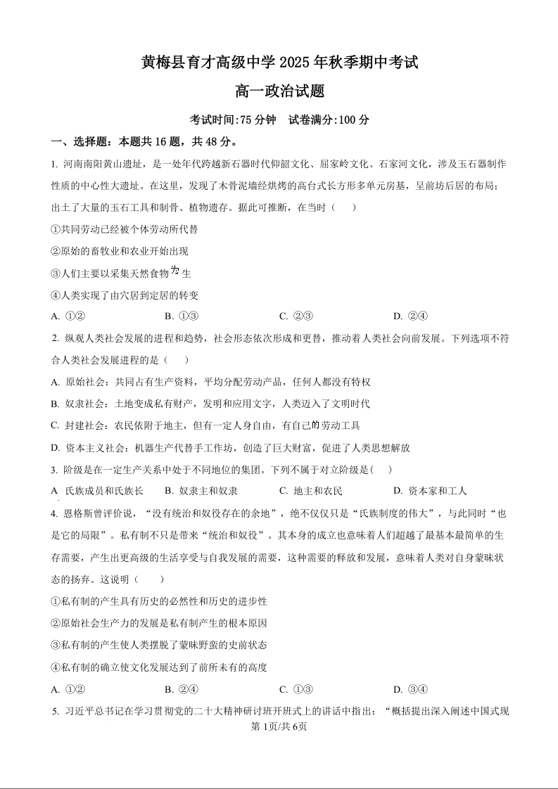 高一政治(原卷版)--湖北省黄冈市黄梅县育才高级中学2025-2026学年高一上学期10月期中考试