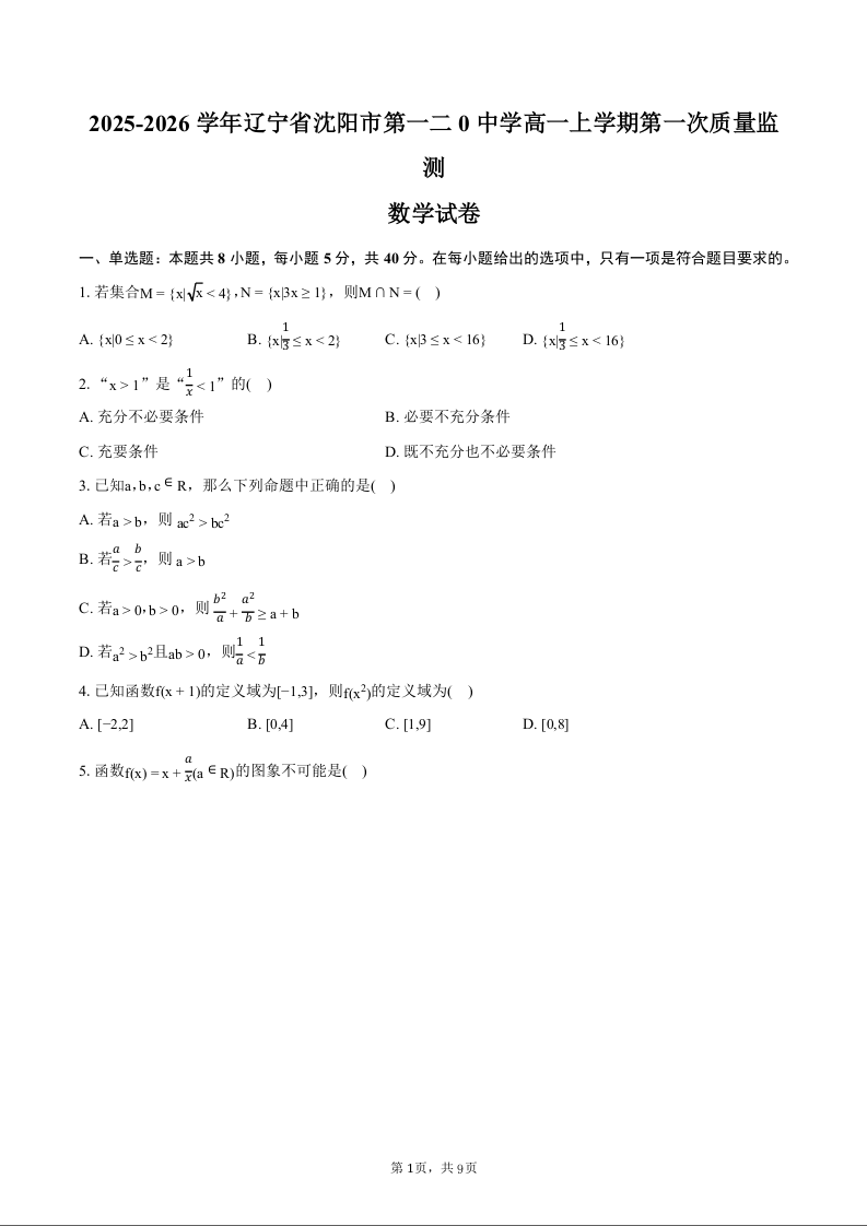 高一数学+答案--辽宁省沈阳市第一二〇中学2025-2026学年高一上学期第一次质量检测