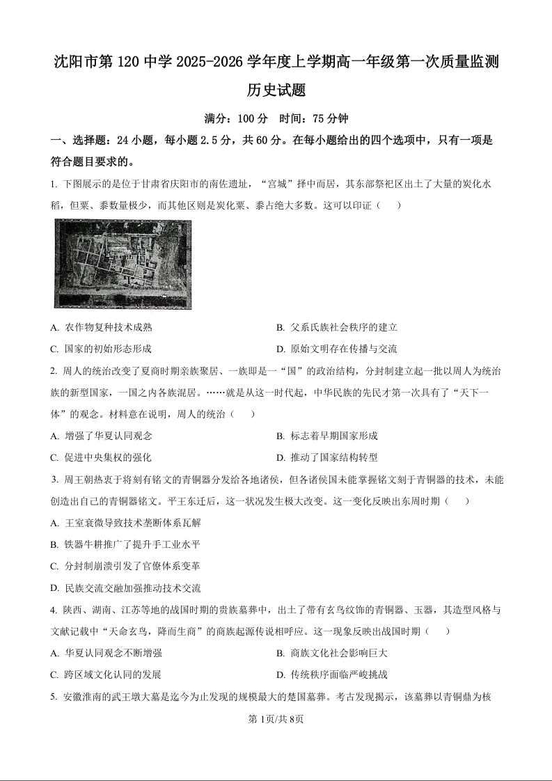 高一历史(原卷版)--辽宁省沈阳市第一二〇中学2025-2026学年高一上学期第一次质量检测