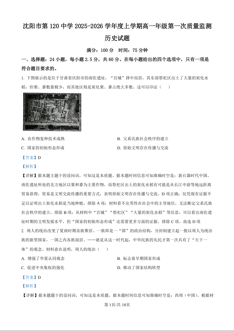 高一历史(精品解析版)--辽宁省沈阳市第一二〇中学2025-2026学年高一上学期第一次质量检测