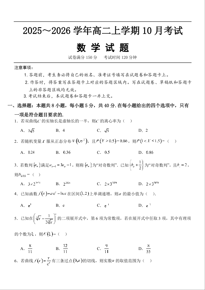 高二数学+答案--河北省保定市保定十校2025-2026学年高二上学期10月月考