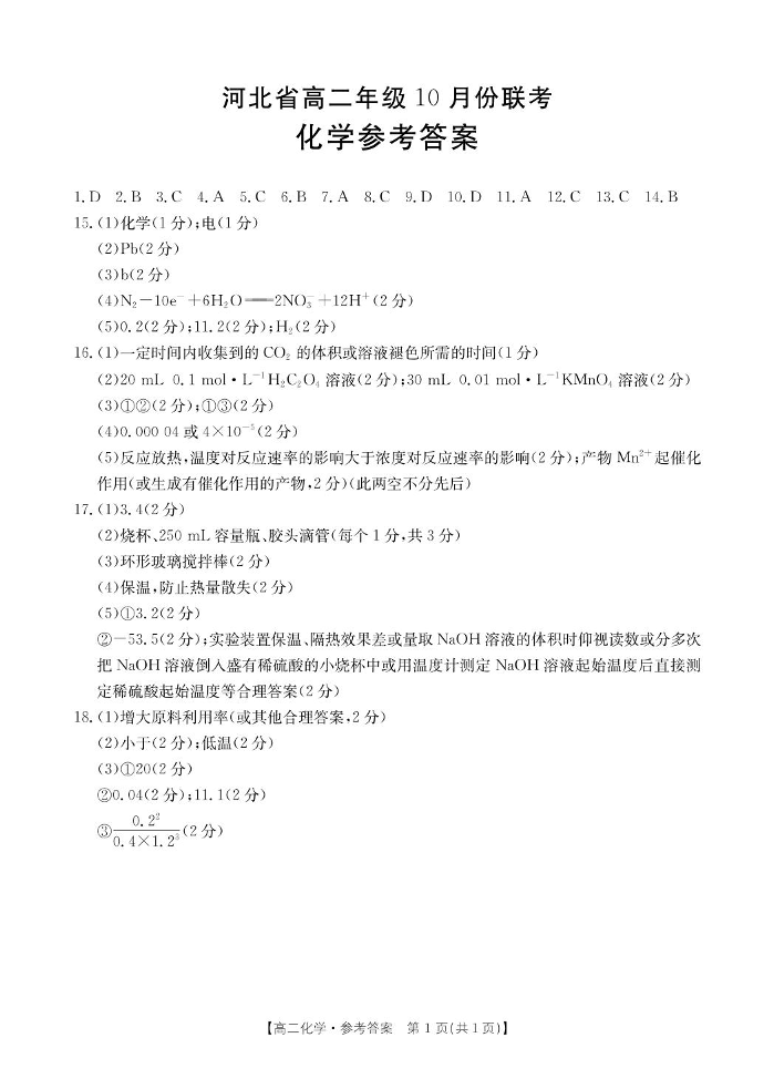 高二化学答案--河北省保定市保定十校2025-2026学年高二上学期10月月考