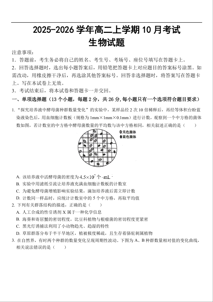 高二生物--河北省保定市保定十校2025-2026学年高二上学期10月月考
