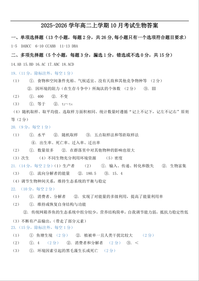 高二生物答案--河北省保定市保定十校2025-2026学年高二上学期10月月考