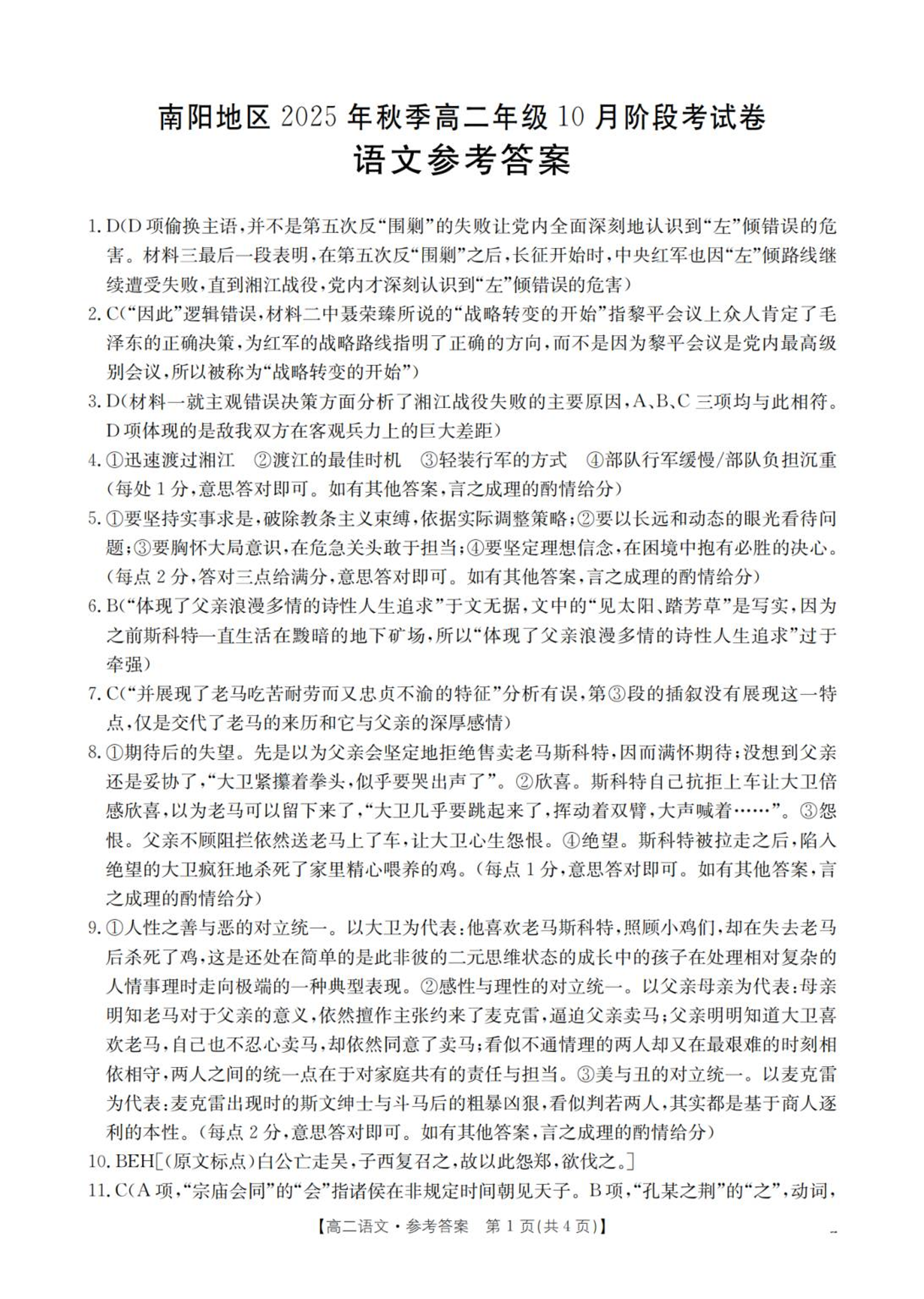 高二语文答案--河南省南阳地区2025年秋季高二10月阶段考试卷