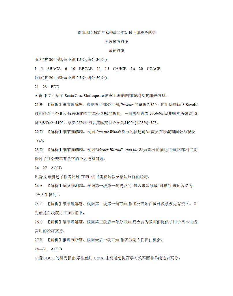 高二英语答案--河南省南阳地区2025年秋季高二10月阶段考试卷