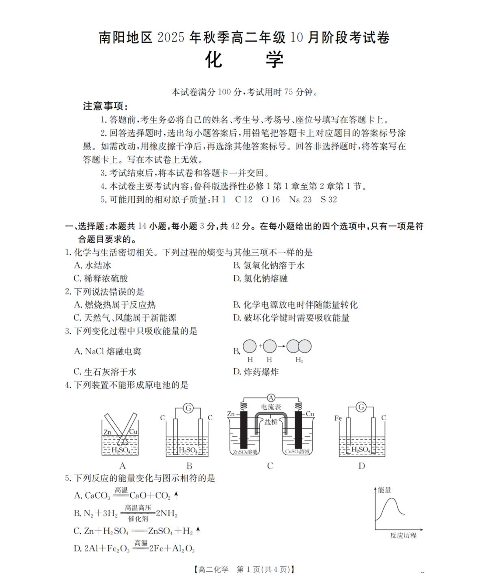 高二化学--河南省南阳地区2025年秋季高二10月阶段考试卷