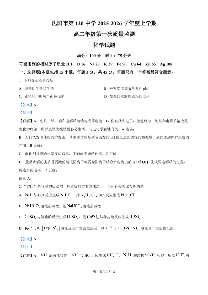 高二化学(精品解析版)--辽宁省沈阳市第一二〇中学2025-2026学年高二上学期第一次质量检测