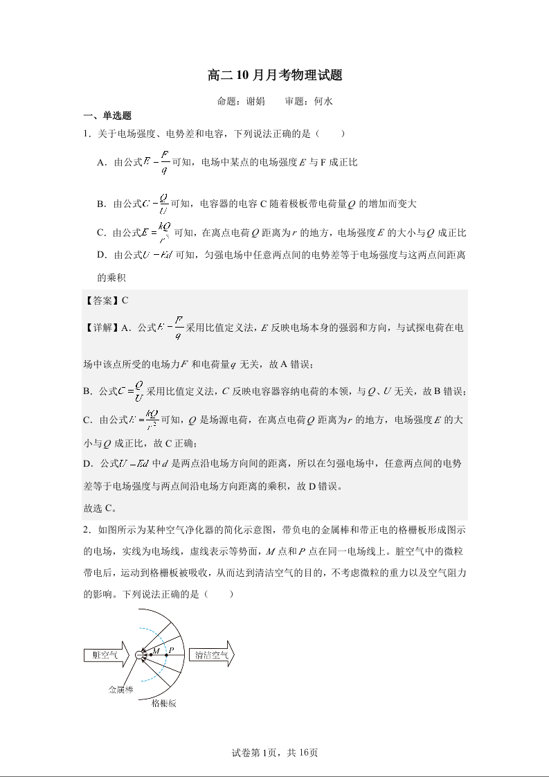 高二物理答案--重庆市万州二中2025-2026学年高二上学期10月月考试题