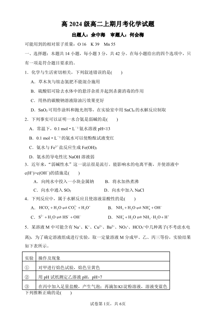 高二化学--重庆市万州二中2025-2026学年高二上学期10月月考试题