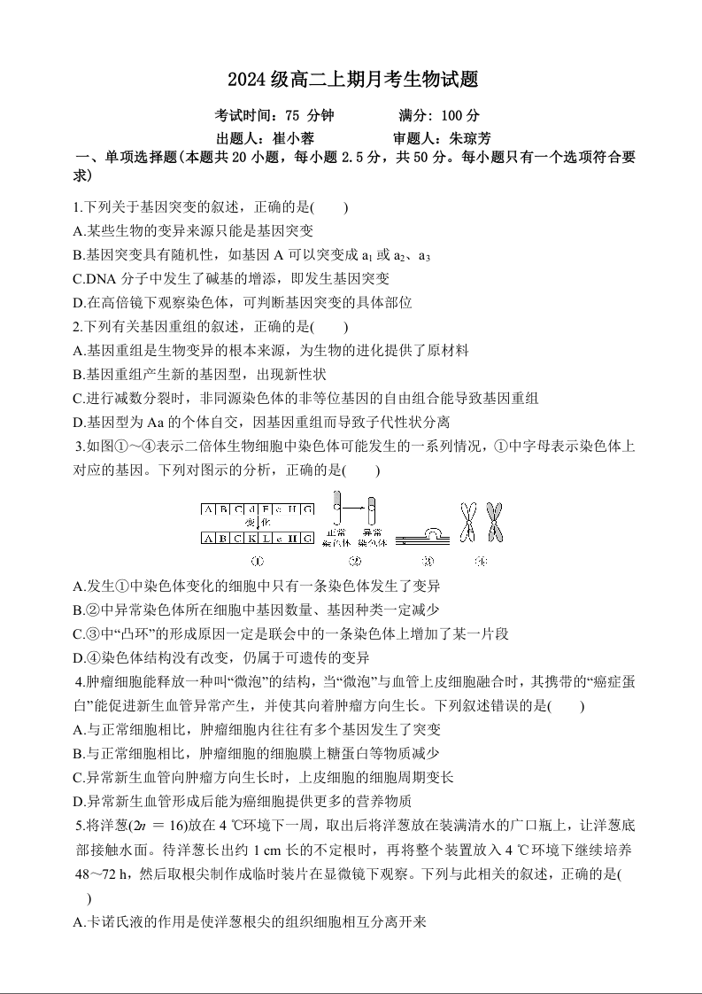高二生物--重庆市万州二中2025-2026学年高二上学期10月月考试题