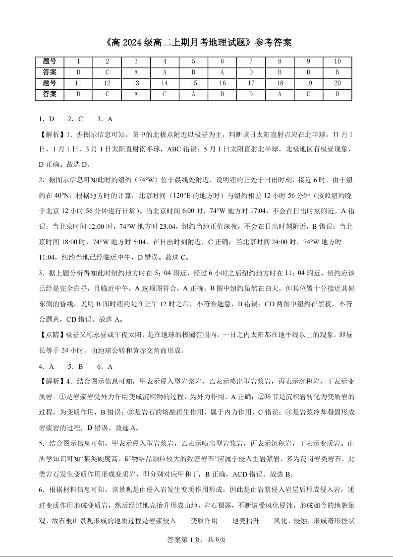 高二地理答案--重庆市万州二中2025-2026学年高二上学期10月月考试题