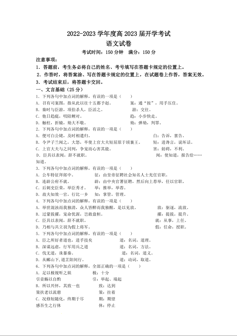 高三语文+答案--四川省成都市第七中学2023高三上学期入学考试