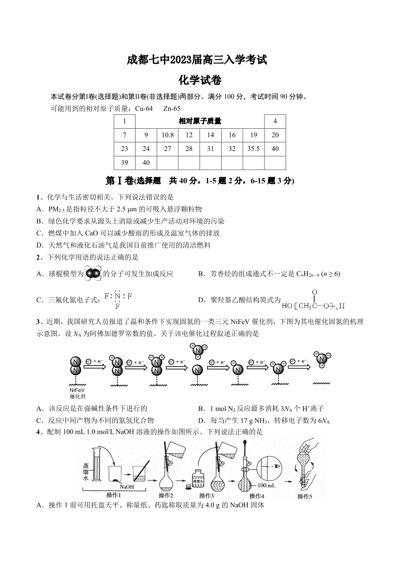 高三化学--四川省成都市第七中学2023高三上学期入学考试