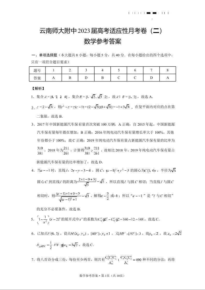 高三数学答案--云南师范大学附属中学23届高三上学期适应性月考卷(二)