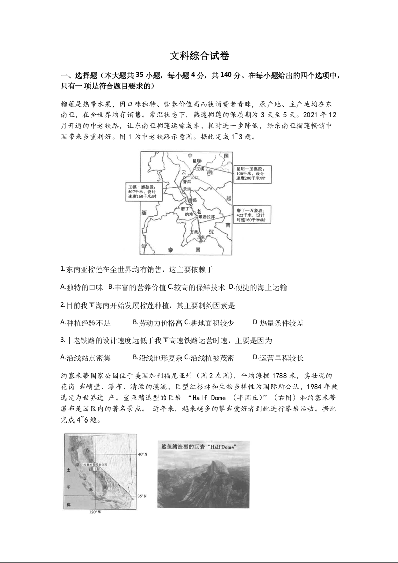 高三文综--云南师范大学附属中学23届高三上学期适应性月考卷(二)