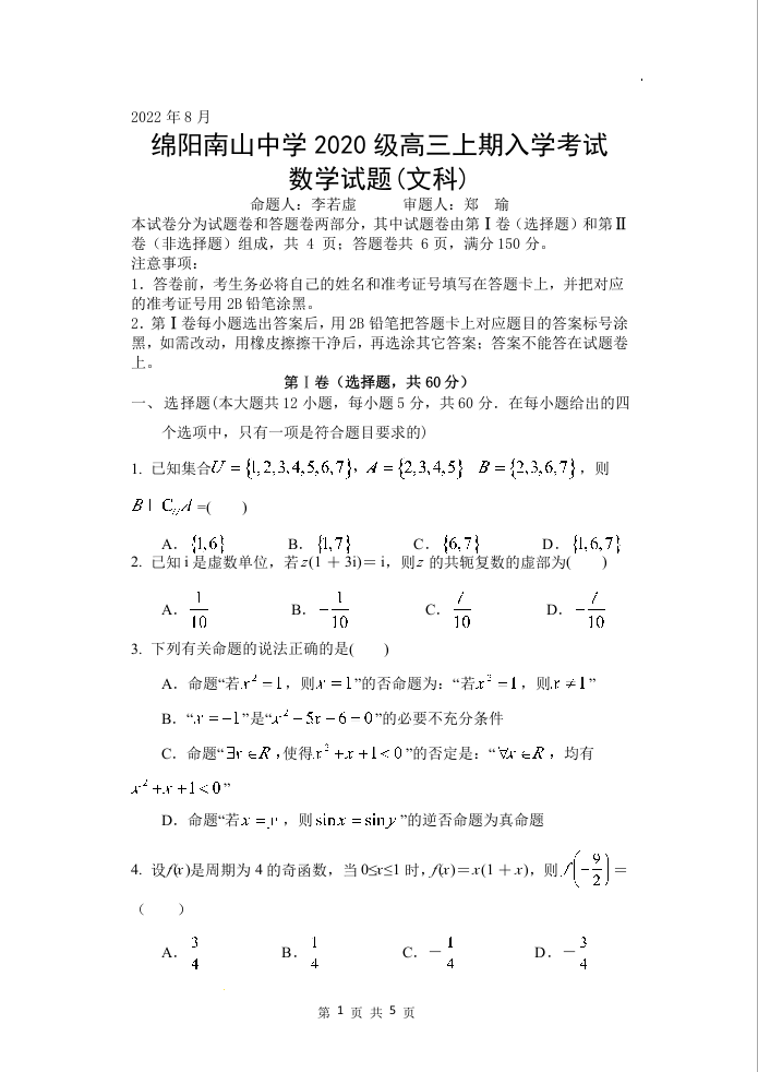 高三文科数学--四川省绵阳南山中学2023高三上学期入学考试