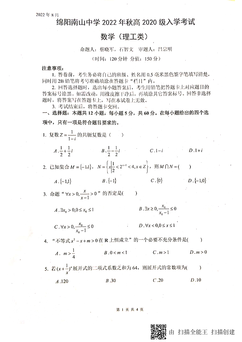高三理科数学+答案--四川省绵阳南山中学2023高三上学期入学考试