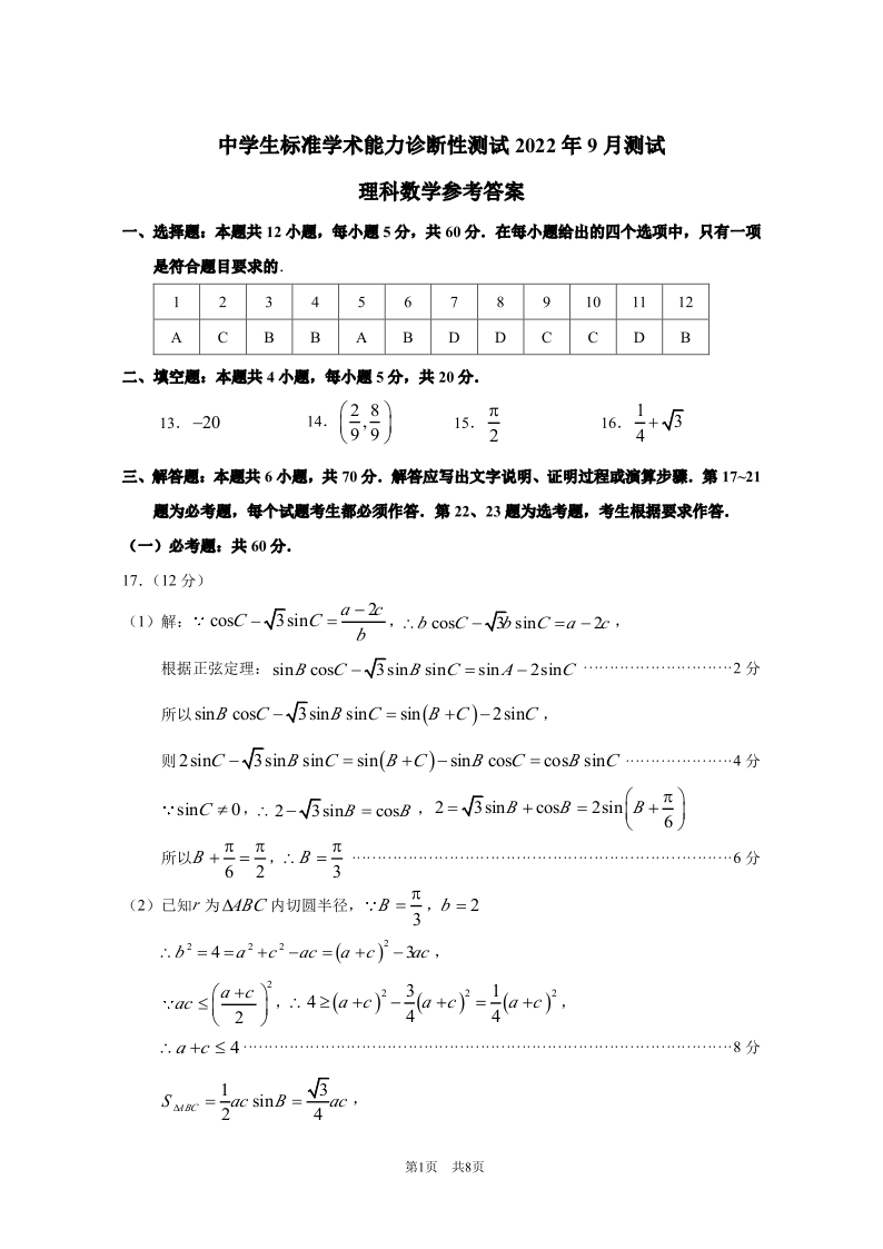 高三理科数学答案--2022年9月中学生标准学术能力诊断性测试测试