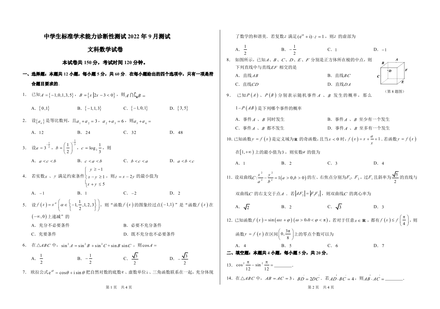 高三文科数学----2022年9月中学生标准学术能力诊断性测试测试