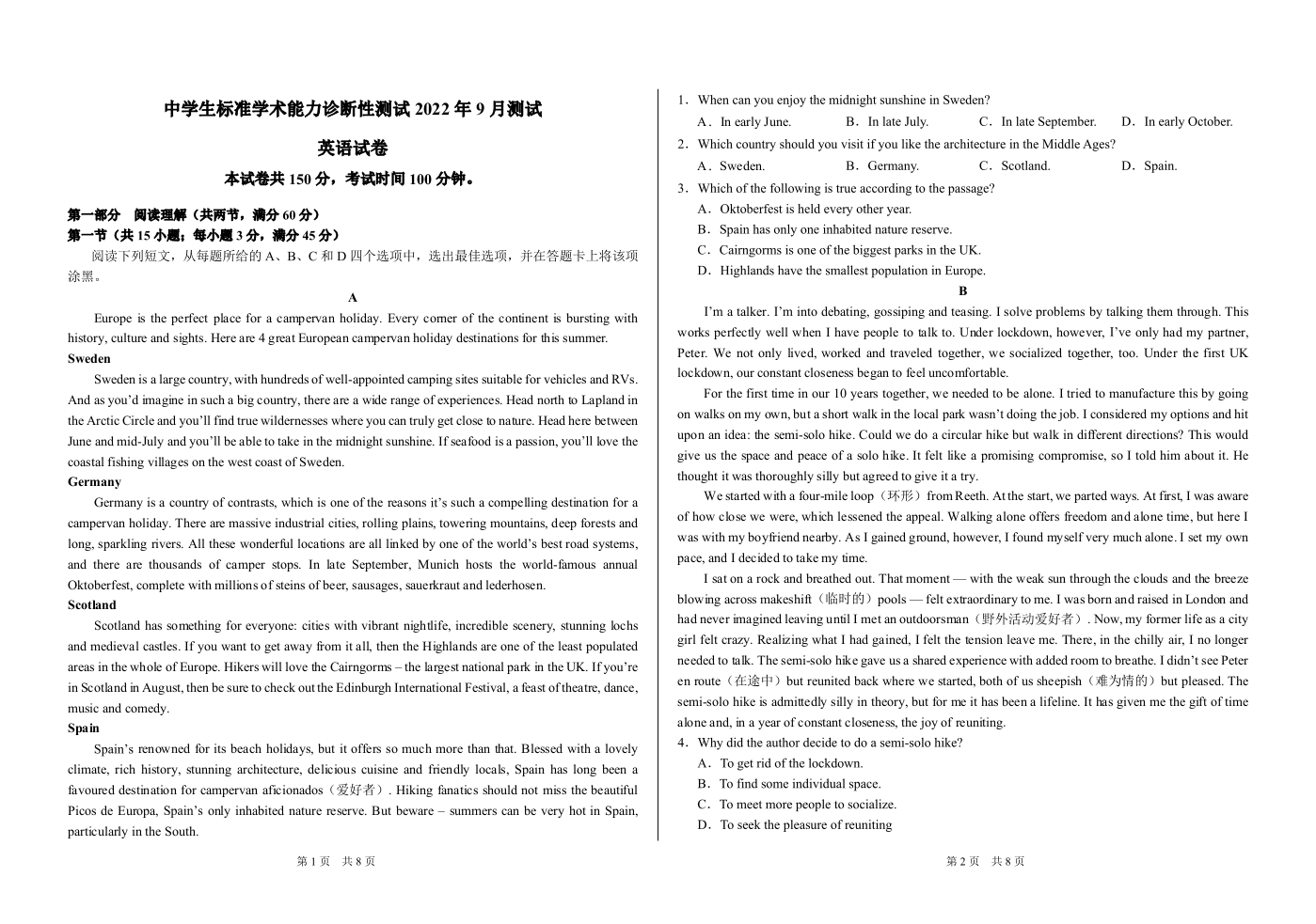 高三英语----2022年9月中学生标准学术能力诊断性测试测试