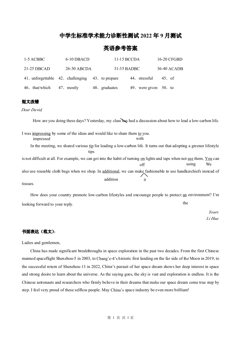 高三英语答案----2022年9月中学生标准学术能力诊断性测试测试