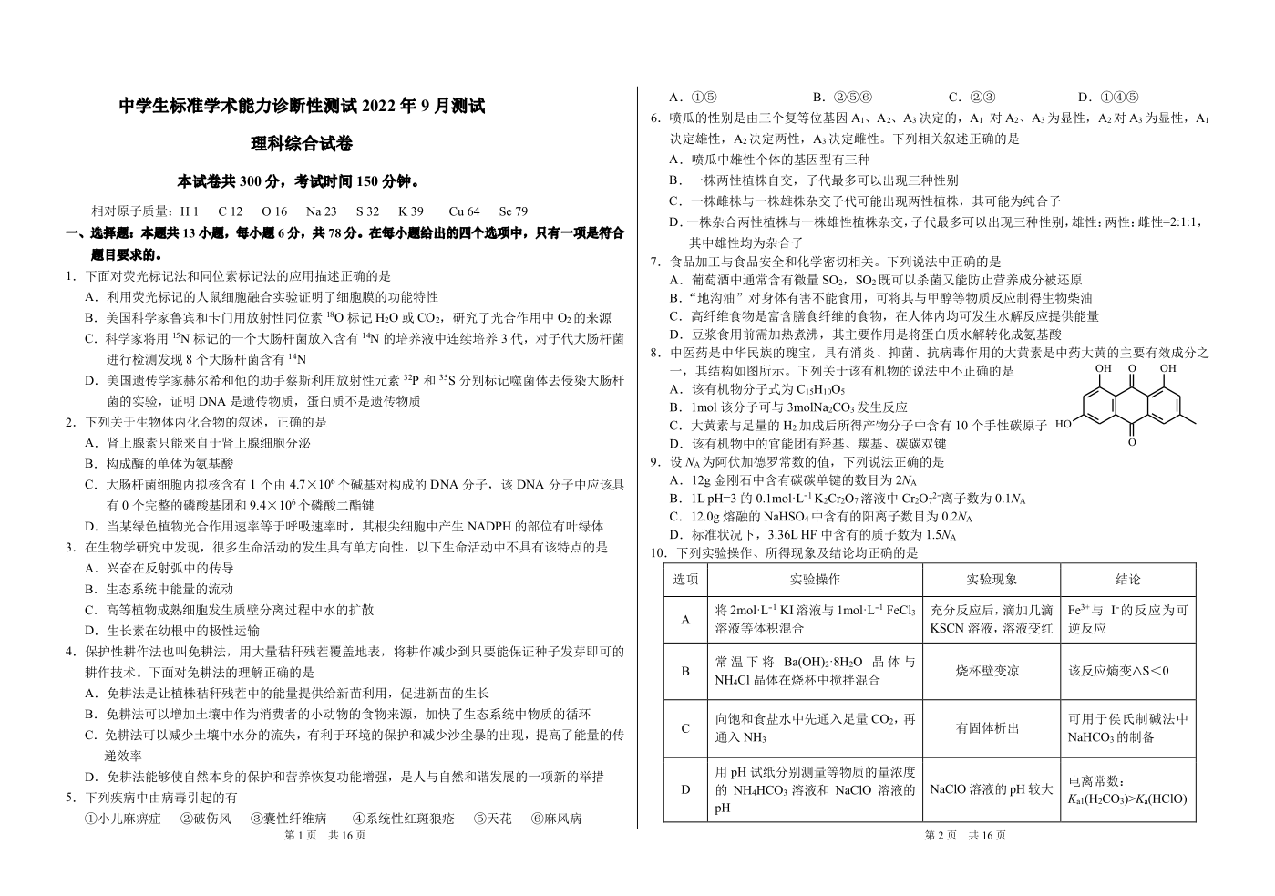 高三理综----2022年9月中学生标准学术能力诊断性测试测试